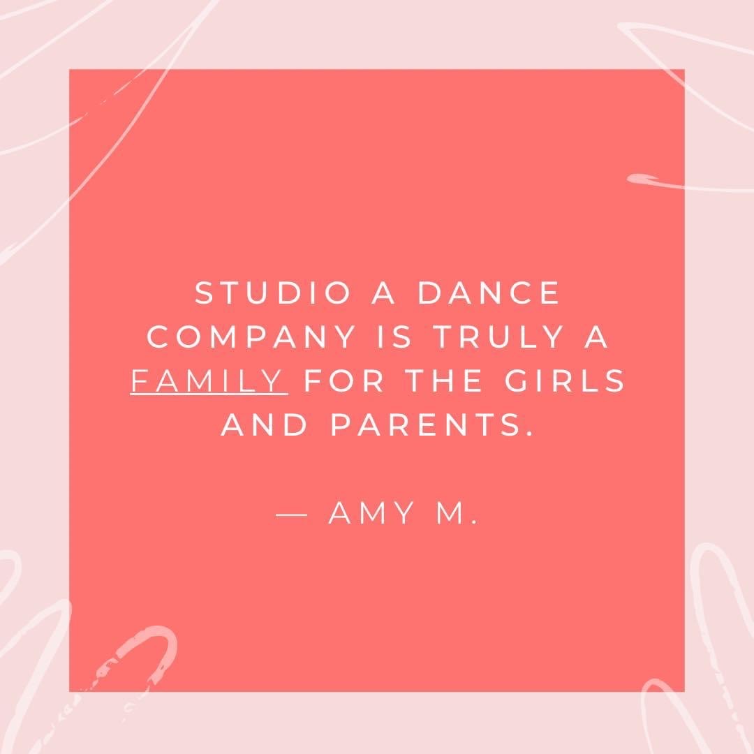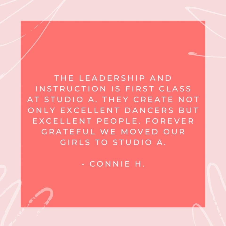 Studio A prides itself on its family friendly atmosphere. We strive to instill values and discipline in a fun and safe environment where students can express themselves through dance. We encourage dancers to find what gifts they have as an individual, as well as what they can achieve as a team.