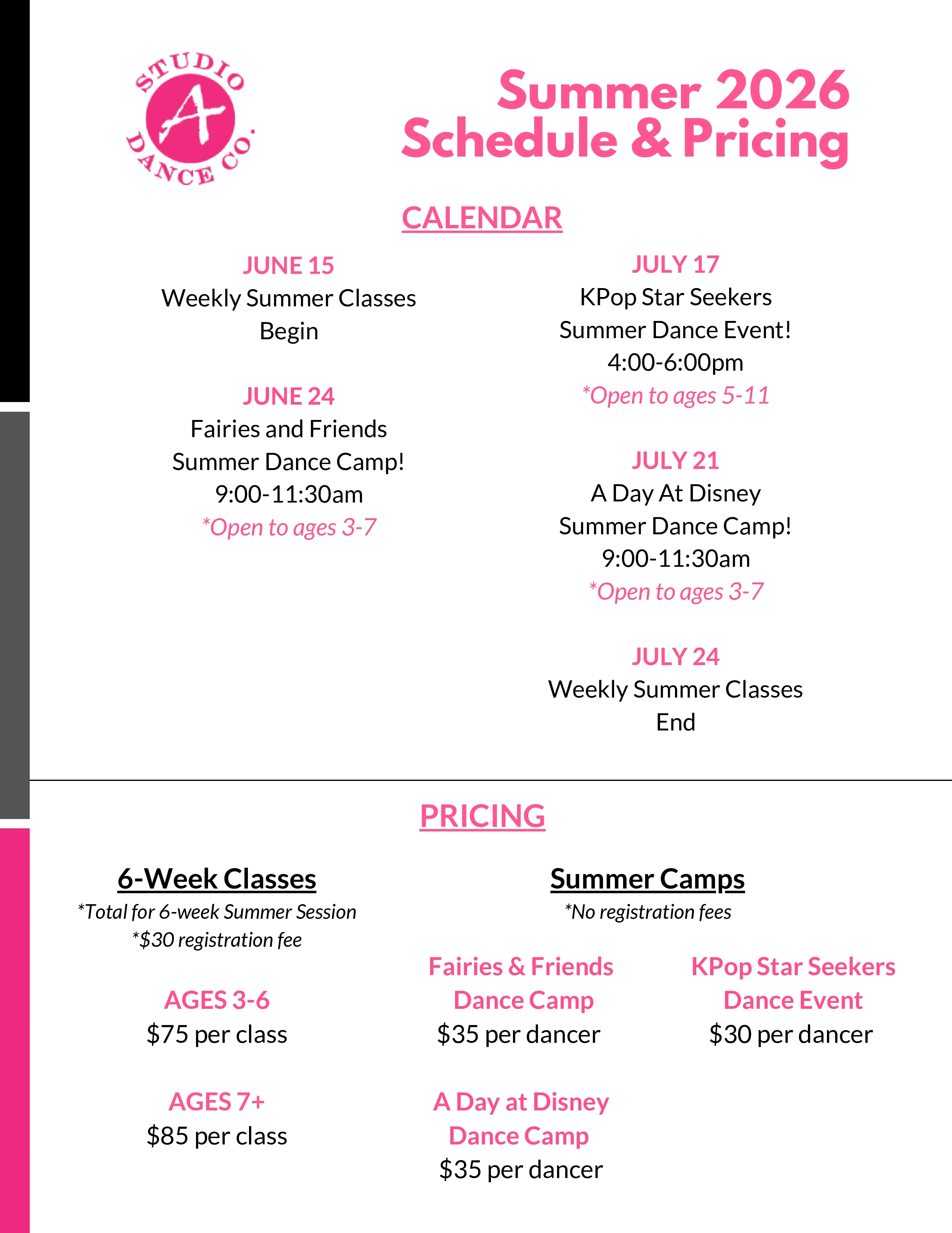 Studio A does not have a recital fee, however, recital tickets do need to be purchased for $15 each.