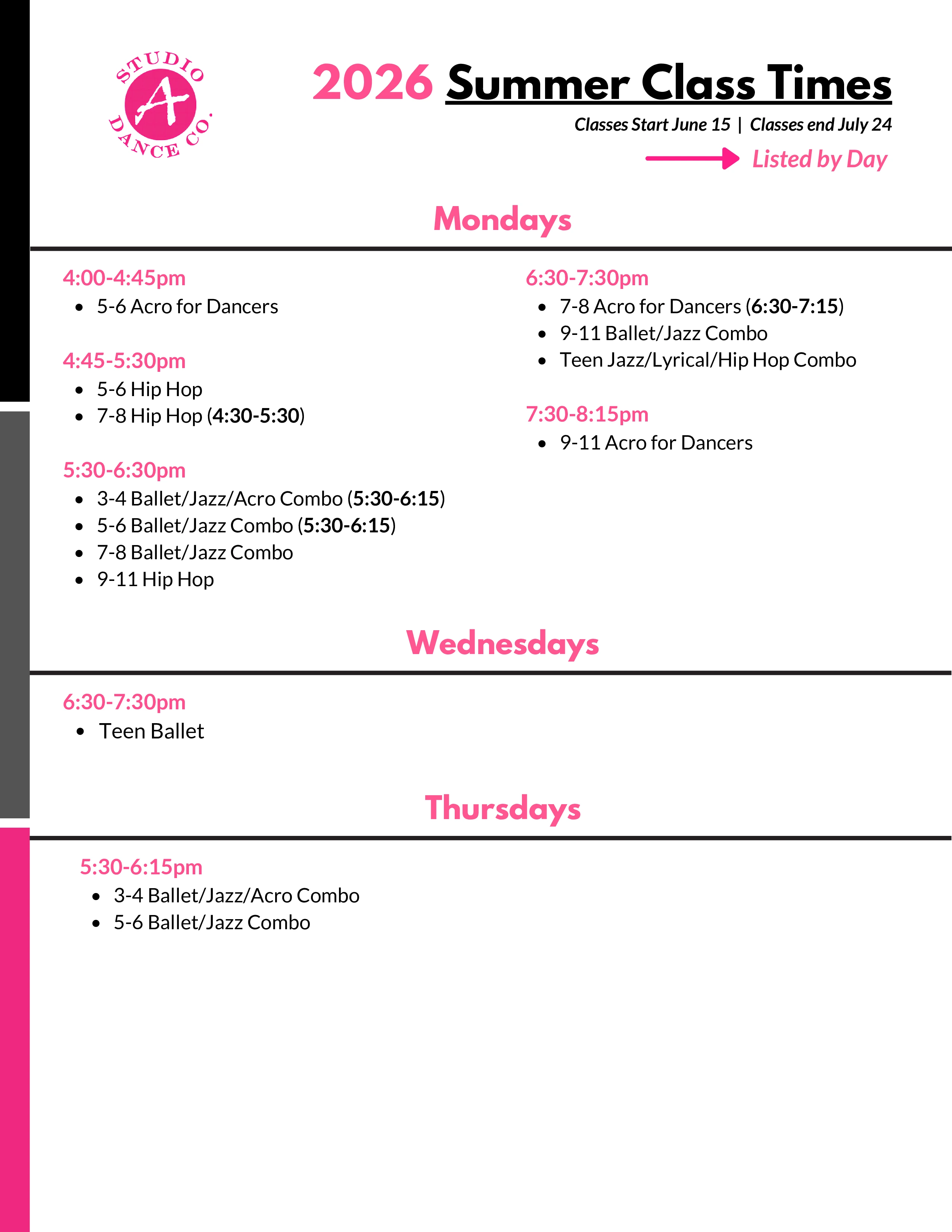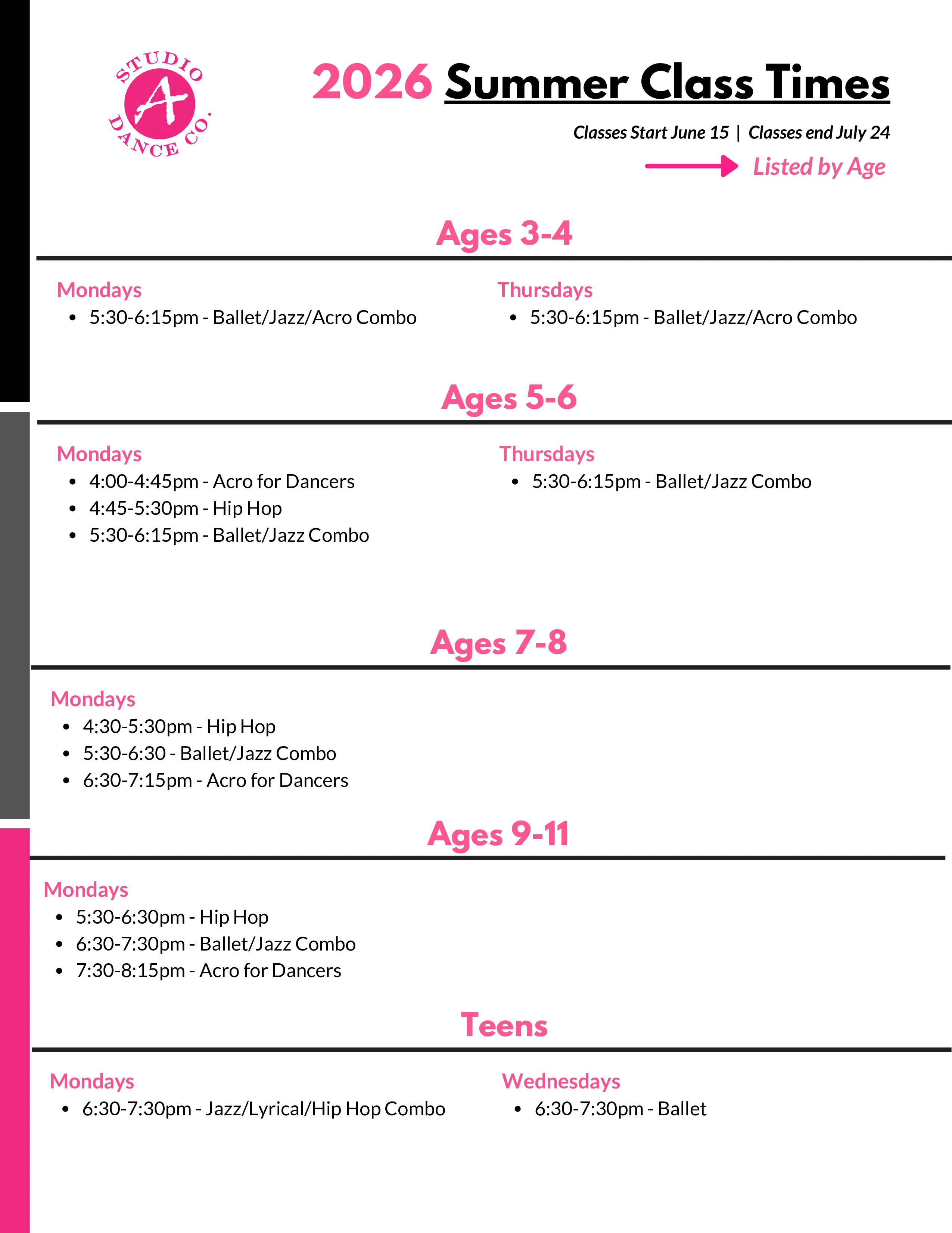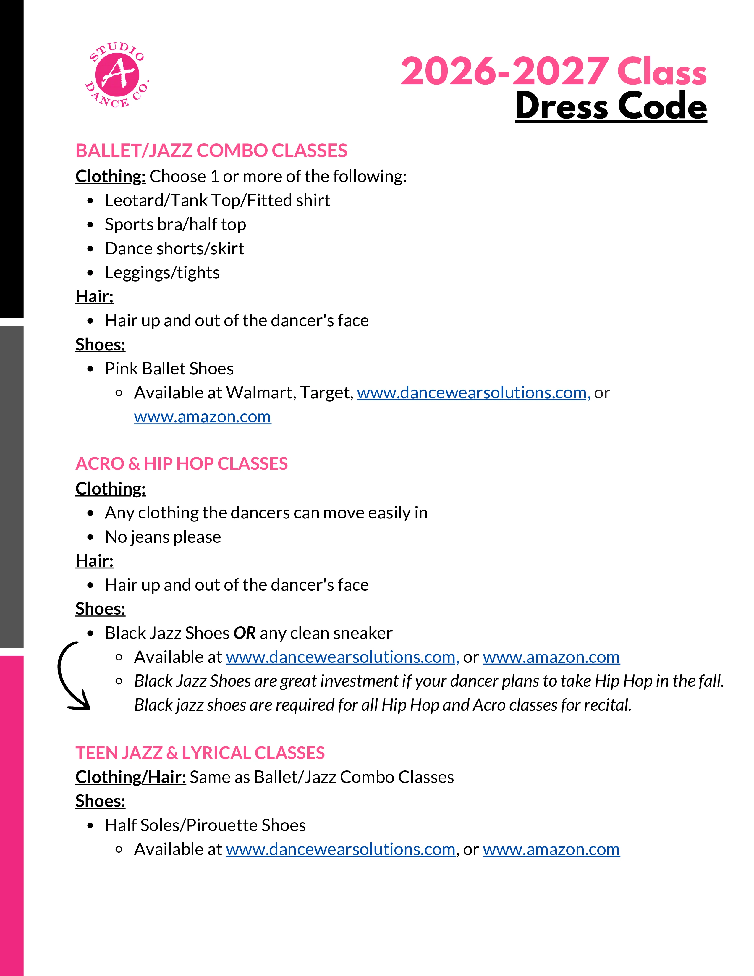 Studio A requires one month's notice of class cancellation. To cancel, please send a drop request via your parent portal. Cancellations will not be taken over the phone or in person, only online.