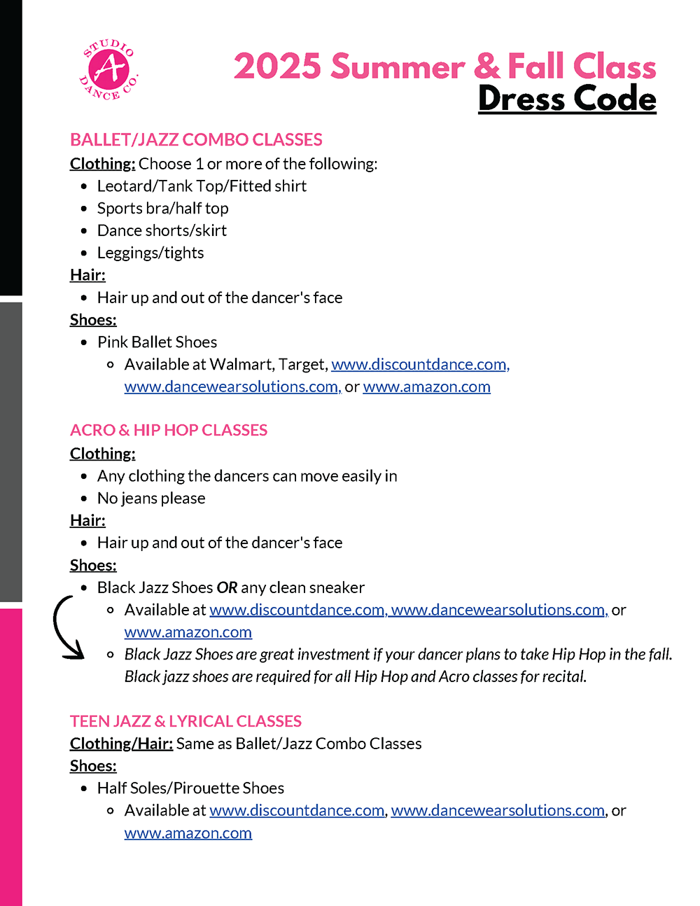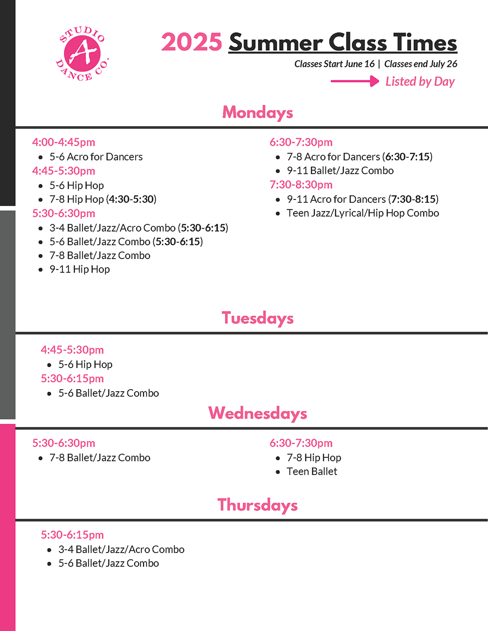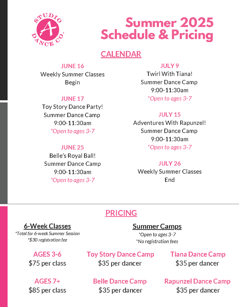 Studio A requires one month's notice of class cancellation. To cancel, please send a drop request via your parent portal. Cancellations will not be taken over the phone or in person, only online.